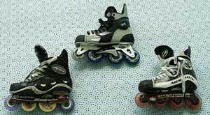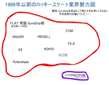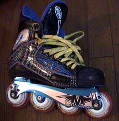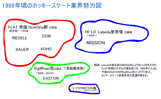 それでははじめさせていただきます。1998年末にはEASTONのF5がセンセーショナルに登場しました。これにより某編集部の金銭感覚が破壊されたの同時に,MISSIONを首謀とするHI−LO連合と孤軍奮闘するEASTON=BigWheelシステムの世界を股にかけた仁義なき闘いが開始されたのです。その蔭で,それまで権勢を誇っていたSureGripを頂点としたいわゆるフラットシャーシ・ヒエラルキーが完全に崩壊したことも忘れてはなりません。同時にアメリカ大陸のごく一部で繁栄していたにV-FORMATION一派がいたことも特記しておきましょう。BAUER一族がRockerChasisを引っさげて参戦してくるのはこれより1年以上あとの出来事です。さて,一時は主導権を握ったと思われていたEASTON=BigWheelシステムですが,徐々にHI−LO包囲網の影響を受け苦しんでいきます。ベー○対V○Sの覇権争いを見るまでもなく,やはり一社では太刀打ちできないうえ,ライセンス供与を渋ったかどうかは定かではありませんが,追従するメーカーが現れなかったのも痛かったと思われます。とにもかくにも1999年シーズンまでは健闘していたEASTONも2000年に入ると闘いの趨勢が見えてきて元気がなくなります。そのまま巻き返すこともなく2000年末になると各地のオンラインショップでダンピングが行われF5のブランドイメージは失墜。さらに2001年になるとBigWheelシステムを断念し,自社シャーシのインラインホッキーシューズからの撤退を表明します。現在ではアイス用のブーツにGEARのHI−LOシャーシを組み合わせたF6なる製品をラインアップしていますが,諸行無常を感ぜずにはいられません。EASTONは特異なシステムと我々の金銭感覚を破壊して去っていったのです。再び画期的なシステムを引っさげて来ることを願わずにはいられません