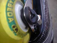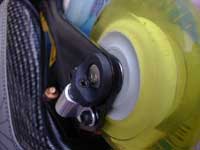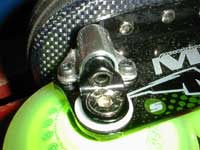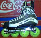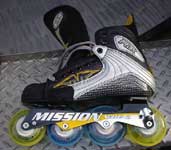 2000年シーズンに入り,MISSIONが満を持してWL(WickedLight)を投入しました。これによりそれまではアイスブーツの改良やローラーブレードからの進化ではない「インラインホッキー専用」のブーツが導入されました。MISSIONのテーマは「軽量化」です。樹脂素材をふんだんに使ったブーツ。それまで定番だったアルミに換えカーボングラファイトを採用することで,シャーシも飛躍的に軽量化されました。軽量化の矛先はホイールにも及びました。ミニマイザーとそれに対応したホイールの採用です。従来の規格であるベアリングよりも一回り小さいミニマイザーの採用は両足で16個あるステンレスパーツの小型軽量化を意味するとともに,ホイールにおけるハブ構造の変化をも意味します。