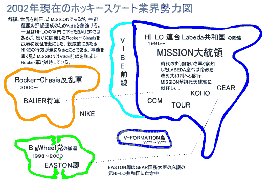 前にも述べた通り,2002年現在,ホッキーシューズ業界は完全にMISSIONを筆頭とするHI−LO連合に支配されています。EASTONなどがHI−LO連合の軍門に下っているなか,残っている勢力はBAUERのRockerChasisだけと言えます。それも孤軍奮闘むなしく,シェアを増やす兆しはございません。そんな中,なぜか安泰のはずの盟主MISSIONのみがあらぬ方向に向かってチャレンジを初めているのは,当講座一同微笑みを絶やさずに見守っていく所存です。WLにより軽量化を,VIBEにより制動と旋回性能を追求した同社の2003年のテーマが気になるところです。いまもどこかで,とてつもない試みが始まっているはず・・・・