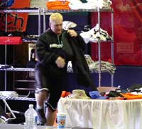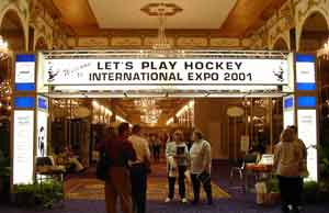 まずは会場であるが,当パリィスホテルの宴会場(日本ならさしずめ「白鳳の間」?)を3会場確保して開催されている。正式名称は「Let's Play Hockey INTERNATIONAL EXPO 2001」となっている。入口で入場証をみせるとおばちゃんがすかさずGEARのビニール袋をくれた。労せずして既にホッキー関連グッズを手に入れてしまった。この先どんな極楽浄土が待っているか,それはもう期待に胸ふくらませてしまった。