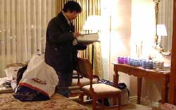 Hockey」コンベンション視察の日なのである。団長は既に起きてお仕事関係のアポに出かけたらしい。「あー,もうこんな時間・・・・」と後悔していると,ふと入場券がないことに気がついた。愕然としていると,電話がかかってきた。「まだ,寝てますか,もうコンベンションが始まってますよ」というありがたい団長のお言葉。もう一も二もなく身繕いをして階下に降りていった。 |