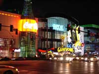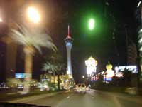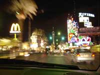 ベガスのゴージャスな夜景に満足したスタッフ一行は今度は胃袋を満足させるため,特に団長の強い希望で醤油系食物を求めベガスをさまよった。しかし,この時間ではどこもかしこもオーダーストップであった。それでも醤油中毒の禁断症状は激しく,怪しげな和物ビデオ屋の店員などへの聞き込み調査を行うも,すべて空振りに。しかたなくホテルに戻った。 |