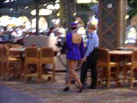 ホテル内のカジノフロアを抜けて劇場の入口に到着。券を見せて無事に入場できた。時間はギリギリであるが2人とも手ぶらで観劇するつもりは毛頭ない。すぐさまバーカウンターの列に並びビールを調達することに。みんな時間が迫っていて少しピリピリしているのだが,あと2〜3人のところで脳天気に「う〜ん,ジンロック4個に,ビール3杯,あとテキーラ3個,あと赤ワイン4つね。」などと言う人は万国的に嫌われる。ちょうどあとに並んでいた数人のアメリカ人と「苦虫をつぶすとどんな顔になるコンテスト」が即座に開催されたのは言うまでもない。 |