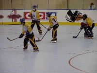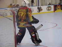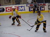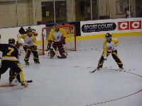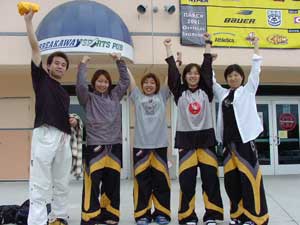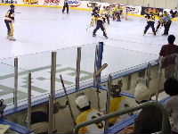 Dragonsである。ん,待てよ,どこかで聞いたことのあるなげぇ〜名前だ,と思ってNARCh2001トロント裏日記3日目をひもといてみると,なんと昨年対戦し1ー4で負けた相手だった。ちゅうことは彼らは地方予選で3位くらいになり,今年はゴールドでこんにちわなのだ。ようするに実力はプラチナクラスといえよう。まあ何はともあれ男子チームはここまで2勝1分け,予選突破は見えている。ここは本戦に向けて勢いをつける意味でも勝っておきたいものだと,勝手にチーム方針を決めて応援することに。本日最後ではあるがあくまでも試合の詳細についてはMHLのホームページhttp://inline-hockey.org/にて高田夫妻のレポートを正座して読みましょう。0−4と残念ながら今大会始めてのシャットアウトをくらってしまったが,試合そのものは拮抗していたのである。気を取り直して明日の本戦で頑張ればいいのである,とこれまた勝手にチーム方針を決めるのであった。
