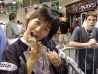 Armadilloを観たので今度はワニと対面する。去年のチンパンくんに続く動物シリーズはフロリダ風情を強調しワニ(アリゲーター)に決定。まあ,TECOアリーナのホームチームもAlligatorsだし当然である。残念ながらホッケーはしないらしい。会場通路の奥の展示スペース(といってもフェンスで区切っただけ)に鎮座していた。お供は白い大蛇くんと子ワニくんである。大蛇くんと子ワニくんは会場のみなさんとスキンシップをはかってくれたのに対して,ワニくんはじっとテーブルの下でジッとしているだけ。う〜ん,存在感だけで充分なのか??