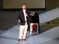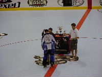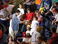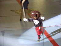 生ビールを飲んでいると,下界では異様な盛り上がりが。どうやらゴールドディビジョンのオープニングセレモニーが始まるらしい。去年トロントではここでMISSIONのT−シャツが飛んできたのだった。もしかしたら編集長&エージェントはもう客席で狙っているのかも,と思うといてもたってもいられずに,下界に降りる。しかし,既に去年もう得てしまったことでやる気があまりなかったのがいけなかったのか,戦果はなかった。あとで聞いたら編集長とエージェントも空振りだったみたい。それにしてもNARChベアの着ぐるみはなんとかしてもらいたいと思う。