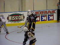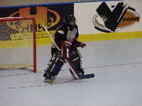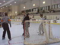 Starsというチーム。予選最終戦であるがこれまで1勝2敗,ここで勝つか負けるかで明日からの行動が「本戦出場NARCh栄光への道」か「フロリダリゾート観光,ビーチが私を呼んでるの!編」に分かれるのだ。よもや後者の道を希望している不届きな選手はいないと信じて応援する。まあ,そうはいっても試合の詳細についてはMHLのホームページhttp://inline-hockey.org/にて高田夫妻のレポートを確認してほしいのであるが,女子選手諸君は見事前者の道を勝ち取ったのであった。ところで,この試合で印象的だったのは相手チームのゴーリーのおねえさんであった。どうやらゴーリーを始めて間もないらしく,足下がおぼつかない。これには審判も気がつき,プレイの合間には気遣うようなそぶりまで誘発。編集部全員もこの御仁に関しては全面的に応援モードになった。