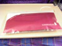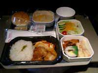 ワインも飲んだし,ナッツも食ったし,液晶モニターも堪能したところで,前方からディナーが迫ってきた。ということでここからNARCh裏日記というよりも機内食日記に切り替えることに急遽決定した。まあ,お約束どおり「チキンorビーフ?」かと思っていたが,それに先だって回教系の方々向けのディナーが配給された。いわゆる御法度ものを除いたメニューなのであろうことは予想される。一方我々無宗教人には「コンチネンタルorオリエンタル?」という選択肢が設けられていた。筆者はオリエンタルを選択,結果以下のようなものが配給された。