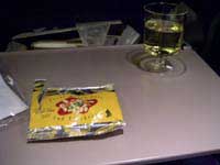 順調に巡航高度に到達。第1回飲み物タイムが開始された。まずはシャンパンといきたいとこだが,あいにく当エアラインのエコノミーにはない,ということで白ワインを注文。アメリカ系のように小瓶ごとくれるのではなく,プラスチックのワイングラスに入れてくれた。もちろんお約束のナッツ袋もくれた。