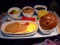 再び映画を観たり,雑誌を読んだり,居眠りしたりして,徐々に時間の感覚がなくなっていった。しかし,昨年のミネソタ,一昨年のフロリダと14〜15時間のフライトを体験しているとLAまでの10時間が短く感じられる。気がつけば朝食配膳のお時間である。パンケーキにオムレツ,ジャムの入ったデニッシュ,それにフルーツにオレンジジュースとコーヒーとご機嫌な組み合わせである。しかも相変わらずあっさり味。