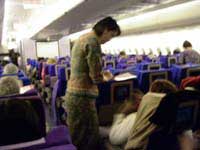 いよいよシンガポール航空の搭乗ゲートへ向かう。動く歩道に乗りながらシンガポール航空の機体をチェック。B747であるが,どうやら新型機。再塗装などの小細工は感じられない。いい感じだ。そのまま搭乗ゲートへ。さすがシンガポールは複数民族国家である。乗客はイスラム系,華僑系,日系,白人系と幅広い。ほどなくしてボーディングが開始した。機内入口で民族服風の制服を着たスチュワーデスが笑顔で迎えてくれた。やっぱシンガポールにしておいて良かった!と思う一瞬である。
