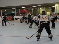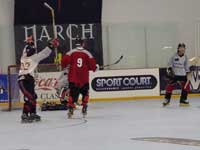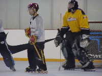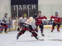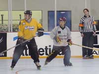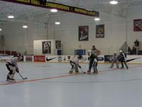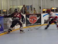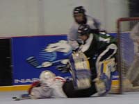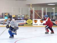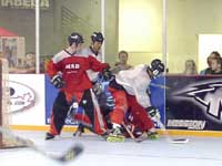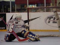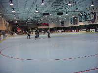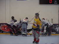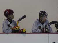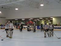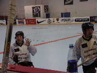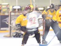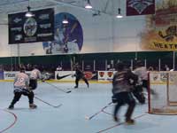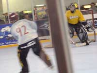 試合観戦に熱が入り,自分の試合を忘れそうになる。急いでキャフェテリアの休憩コーナーで着替える。急いで着替えてスタンバイするが,カメラマン泉は試合中。仕方なく今回は写真は諦めることに。さて試合を開始してみると相手はOld Hosersというチーム,なんと相手に銀ヘル人が3人もいるではないか。なんとNARChPROの試合を終えた御仁が参加しているという光栄というか不運に見舞われる。最初1シフト出場したが先制され,ここは負けられないので,2セットに固めて勝負に挑む。というわけで筆者はベンチで応援に勤しむ。こんなことならカメラを持って来ればよかった。後半最後点差がついたので,出場させてもらう。リンクに出ただけでGOLD男子の皆様の声援がリンク中に響き渡った。運良くフリーでパスをもらい走り込んできたS原氏にパス!あともう少しであったがやはりNARChPROの壁は厚い。相手ゴール前に陣取っていたらシュートのリバウンドが目の前に・・・・そやっ!!と力を込めてスチックを振ったが,腕がまったく動かない。目の前にパックが転がっているのだが,相手のディフェンダーに完全に動きを押さえられていて微動だにできない。そのまま「ウ〜〜〜」と唸ったまま,パックはクリアされてしまった。さすがNARChPRO!その圧力を肌で感じてすごすごとベンチに退散する筆者であった。