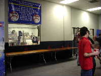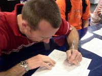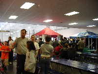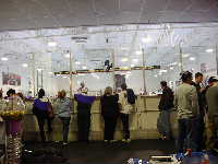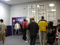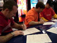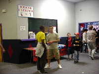 さて2日間飢え死にしないで済む手はずが整ったのでリンクに戻る。先程の女子のみなさん同様我々も登録作業に入る。ここで今回のゴーリー担当Oまたさんが登場。実は筆者の友人と同じ職場だったりする。リンクの外と内で人格が変わる謎の中国人デビッド・チェンも男子ゴールドを終え参加。そして団長の親友ポールをはじめ外人助っ人部隊も登場。やっとメンバー全員で顔合わせをした。一昨年もOver35に参戦したプライムのダンナは今回自分がコーチする女子チームも引き連れているのでテンションが高い。さっそく登録を日本語でやると息巻いている。団長といっしょに適当な当て字を考案してあげると,大喜びでこれを真似てサインして,通りかかる知り合いに自慢していた。もう一人助っ人リー(そう昨年のセントポールでトレーラー車を出してくれた人です)はいたってクールである。