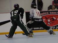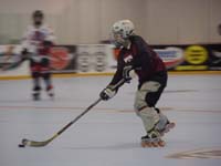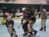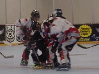 って泉カメラマンなんと筆者中心のサービスショットである。これはこれでありがたいのであるが,試合の内容がわかりづらいので解説しよう。Flingstonesはアイスのチームらしく,インラインはあんまり滑れていない。全体的に我々がパックを支配していたのであるが,一瞬の隙をつく速攻での決定力(これがまた狩猟民族的!)とゴーリーのでかさが幸いし試合を優勢に運んでいった。最後も2セットまわしで疲れた相手に猛攻を仕掛けるが,ゴールを割ることはできずに1−2で惜敗。なんか攻めていて負けたので全員負けた期はしない。まあ,でも生きて戻れたことは感謝しよう。