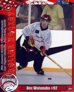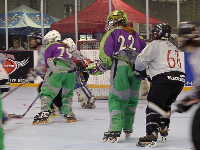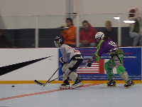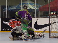 パパとバーに直行し試合を観ながらチーズバーガーをほおばる。そこにポールが合流。夏のファイナルはフロリダに決定らしい。夏もいっしょにやろうとか言って盛り上がりながらメインリンクで行われている女子の最終戦を観戦する。相手はLas Vegas Hotshotsというから地元のチームなのであろう。しかし,試合が開始してみるとゴーリーがいないで,急造であることが判明。これはおいしいとばかりに,なんちゃってゴーリー相手にチーム・ミスコンダクトが得点を重ねていく。後半になって本職ゴーリー嬢が登場。試合時間が前倒しになっていることに気がつかなかったのであろうか。さあ,これから本番と思ったが,ウォームアップ不足か彼女も当たっていない。結局後半は点の取り合いとなったが7−4でチームミスコンダクトの圧勝であった。ここで女子は予選突破!明日は本戦だ!と思っていたのだが実は女子は5チーム総当たりを行い,勝ち点上位2チームによる決勝のみが行われることになっていたのだ。チーム・ミスコンダクトは勝ち点4で惜しくも決勝を逃してしまった。ということは我々がチーズバーガーをほおばりながら観ていた試合が最終戦となってしまい,明日また写真を撮ればいいやと気楽に構えていた筆者にとっては大いなる誤算となった。ちゅうか大会要項をちゃんと調べとけ!である。ということで,遠景からの写真で御免。