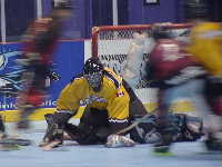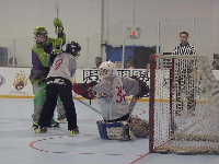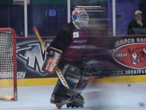 (相手のゴーリー,ジャージの上に防具を・・・おいちい)