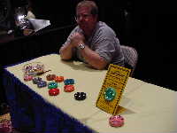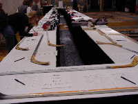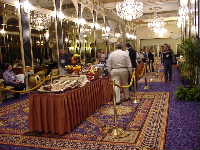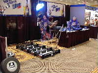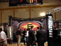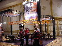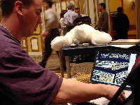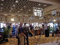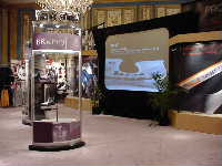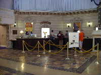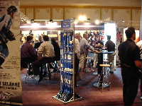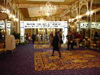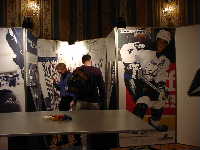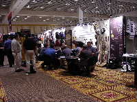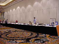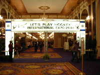 パリスホテルのロビーとカジノを突っ切り,ショー会場の入口に。団長が既に待っていた。スチックを手渡して,いざ入場登録へ。「すみませんねぇ〜,今年は事前登録してなかったんで,ちょっとやってみてください。もし,だめならなんとかしますんで。」そう一昨年はミスコンダクトの一員ということで入場証を頂いたのだが,今回は自力突入を試みることにしたのだ。そしてこの日のために「超初心者講座・筆者」という(インチキ?)名刺を某社デザイナーに依頼してまで制作してしまった。果たして我が「超初心者講座」北米ホッキー業界に受け入れられるのであろうか??ちょっとドキドキしながら受付に。前に並んでいたおばちゃんは,ホッキーママらしく無防備で突入を試みていたが,一般人の入場はかなり狭き門らしく係りの者と言い争いをしていた。それを横目に東洋の怪しい男が受付嬢(いや,おばさんだった)に挑戦だ!