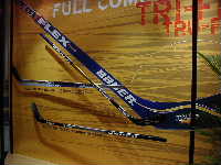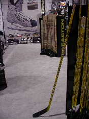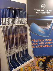 今年の一押しはやはり鮮やかなブルーが目に眩しい「M−1」である。いままでDanglerやらFlyweightなどでうんちくをたれてきたものの実際のブツは今ひとつアピールに賭けるものであったのは否めない。そんなEASTONの後塵をはいしてきたMissionがあなたにお送りする至福の1本がこのM−1である。昨年夏のNARCh会場で既にサンプルは展示してあったが,今回は満を持しての投入ということで,ティーム・セラニをはじめとする複数の選手と契約,NHLを使ったマーケティングを展開している。