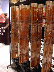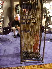 まずは展示コーナー左側を占めるスチック群。主力はやはりSynergyである。昨年は銀色に輝く元祖ノーマルSynergyとグリップ加工を施した金色のSynergyGripを展開していたが,今年はさらに2モデルを追加。1つは黄色がまぶしい,