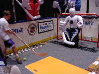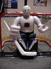 ある意味で今回一番目を引いたブースとも言える。なにしろ等身大のゴーリー人形がレールに沿ってジーコジーコと動いているのである。誰もが思いつくものの,それを具現化してしまう根性がスゴイ。あまりに強烈なので思わず話しを聞いてしまった。操作方法は2通りあり,1つはリモコンを使ってマニュアル的に操作するものと,勝手にランダムに動く自動操縦モードである。ビニール人形なので強度的にはボールで勘弁という感じ。リモコンのレスポンスはかなりよく,珍妙な人形の形態と相まってかなりコミカルな動きとなる。でもNHLのライセンスを獲得しメーカーとしてはマジモードである。これから発売とのことなので,今後の動向に注目したい。