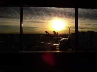 なんとかゲートにたどり着き,荷物を置いて一息。みなさんかなり気だるそうな感じ。夕日がキレイだったので撮ってみた。