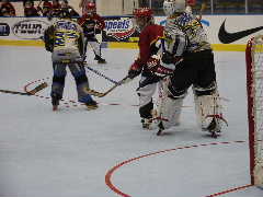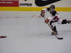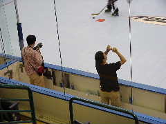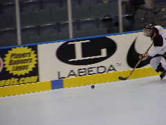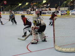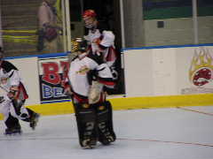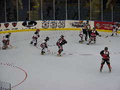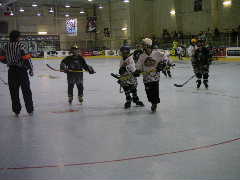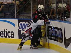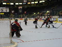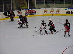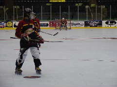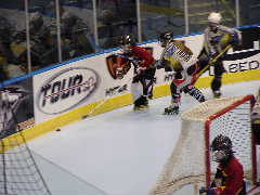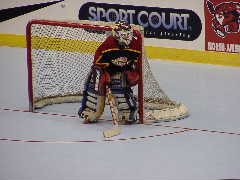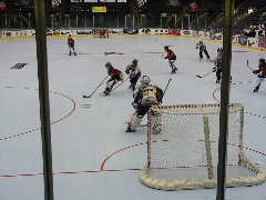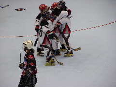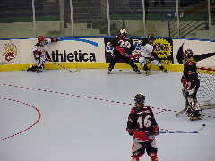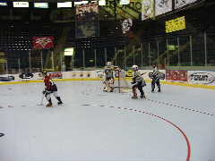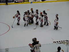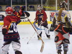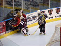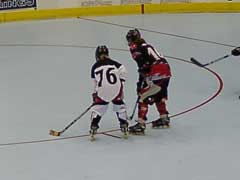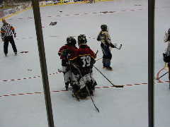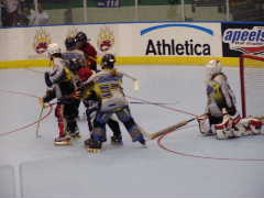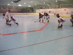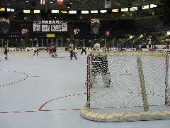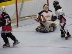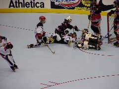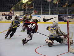 Vixensを破った勢いを止めることは出来なかった。というよりさらに勢いに乗った。試合の詳しい経過,客観的な分析は高田夫妻によるMHL公式レポート(http://www.inline-hockey.org/narchfin/2003/index.html)にお委せするとして,この試合のハイライトはなんといっても関西よりの刺客よっしーのハットトリックであろう。公式レポートにもあるとおり,第一試合は固いディフェンスで最小失点差で勝ったのであるが,この試合では両セットともにディフェンスからオフェンスへの切り替えが機能し,セット内での連携により得点出来たことがすばらしい。やっと各人が国内での実力を発揮したといえよう。なにしろ観ていて気持ちよかったのである。あ,ちなみに試合結果は5−2である。とまあ,ぐだぐだいうよりも写真を観ていただこう。