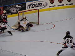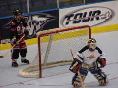 (相手ゴーリーと対峙するよっしー,Vixensの人はM−1を使用してるが,そんなとこに気がつかなくてもよろし)