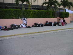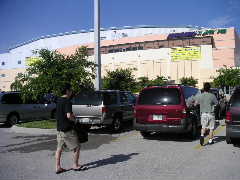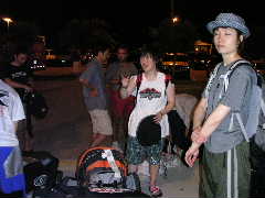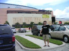 満腹になった一行はいったんホテルに戻る。ホテルのフロントに入ると,突然長髪色黒のあやしげな(失礼!)東洋人が満面の笑みでまゆみさんに話しかけてきた。すわ,非常事態か!と思ったが,なんと小金井公園系,元SWEEPERS,元武田園,そして某豊島園では某ホイジンガーでいっしょにプレイしてくれたしょうちゃんだった。昨年アメリカはフロリダに渡った(グリーンカード取得したんです)のであるが,我々の参戦を聞きつけてクルマを5〜6時間ほど飛ばしてはるばる応援に駆けつけてくれたのである。前はわりと短めの髪型だったので,一目ではわからなかったのである。