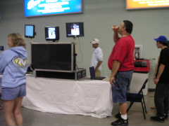 Vixens。昨年も惜敗しただけにぜひともリベンジをしたいところだ。今年も試合の正確且つ詳細な内容は高田夫妻によるMHL公式レポート(http://www.inline-hockey.org/narchfin/2003/index.html)を参照するのが正しい。で,筆者的に見ると,Vixensは今年優勝候補ということもあり,最初はかなり余裕バリバリで臨んできた。しかし,今年のTeamMisconduct,参戦4年目ということもあり,でかい相手には慣れてきているのであろうか,早めのチェックで相手のプレイをさせない。逆に正確性を欠く相手のプレイに対しては,カウンターで応酬。Vixensは攻めてはいるが決定的なチャンスを作れずに,徐々に焦ってきた。そこで後半逆にTeamMisconductが混戦から1点を入れて,さらに焦りを呼んで,固いディフェンスで守りきった,という感じではなかろうか?(←なんで自分で観たのに疑問形なんだ!)ゴーリーいずみ&高位ちゃんによる連携シャットアウトが光る。1−0と薄氷ではあったが優勝候補を下し,幸先のいい出だしであった。まあ,筆者が語ってもあまり説得力がないので,写真を観ていただこう。