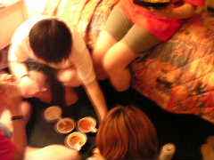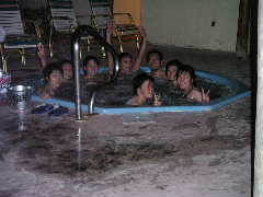 ビールでいい気分になった一同は,やっぱピクニックは外だろうとプールへ。キャプテンのりえの命により各自水着持参である。泳げない系のまどか,筆者,お疲れ系のちびっこはプール脇の極楽イスに座って見物。みなさんの水着姿を写真に収めるのはセクハラか!?という疑問も起こり,すかさずカメラをまどかに託す。なのでこれ以降は筆者の責任ではない(逃げの一手)。深夜のプールでリレー大会が催されたことは周囲の泊まり客には内緒である。ついでに負けチームによる罰ゲームも密かに実行された。そういえば,ちびっこがある人の泳ぎを見て絶句(xxさんのあんな姿は見たくなかった伝々)していたのだが,ちびっこ体験記に書かれるのであろうか。