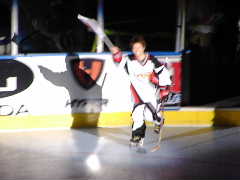 暗いアリーナの出入り口にスポットライトが照射される。「Forward, Number20, Madoka Haraguchi!!!」のMCが!同時に該当者が日の丸を手に堂々の入場。すばらしい演出だ!残念なのは筆者の腕ではスポットライトのまどか嬢を捉えきれないので,写真はボケボケになってしまったことだ。やっぱ,来年はもっと高いカメラを買おうと決意した一瞬である。そして順々に名前をコールされてみなさんが入場してきた。しかし,相変わらず筆者のカメラはボケボケの連続である(やはりカメラではなく腕に問題があるのか?!)。ごめんなさいなのである。