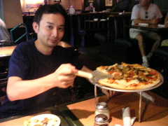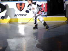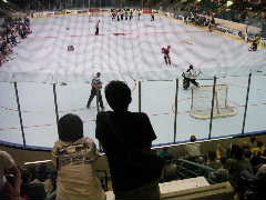 またまた昼を食べそびれた筆者は,ゆうじくんを頂上のラウンジバーのほうへ案内。ビールとピザを注文し,団長も認める究極のホッキー観戦へとゆうじくんを誘う。いつかはMHLでも実現して欲しい企画である。確か試合前なので,ゆうじくんはビールを飲んでいないはず,たぶん。