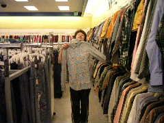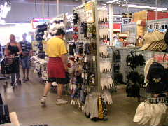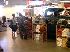 Less」とはっきりポリシーが貫かれているのが気持ちいい。店内に入るとおびただしい数のアパレルが品目毎に陳列されている。といってもなんとなくサイズ毎にグチャッと並んでいるので,この中から掘り出し物を発掘するらしい。衣料全般に若干のインテリア系などもあるがどちらかというと婦人物が多い感じ。看板のとおりディスカウンターなので,訪れる人もあまり見栄などなく,アメリカ標準でいくとダサイのかも。なかにはほんと誰が買うのじゃ!?というものも多い。でもT−シャツやシャツ類は豊富にある。これらを発掘するのもかなり疲れる作業である。だんだんカックイイのかダサイのか判断が鈍ってくる。例によって筆者はまたもやT−シャツを購入。かなろーなどはハーブ系石鹸類などおみやげ類を物色していた模様。