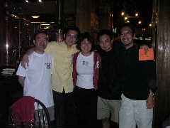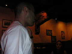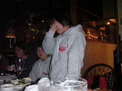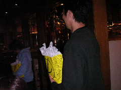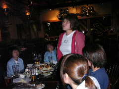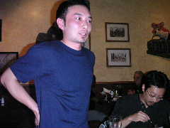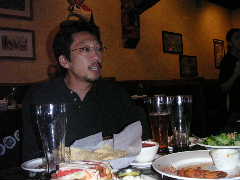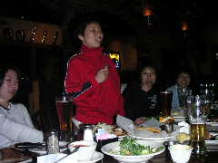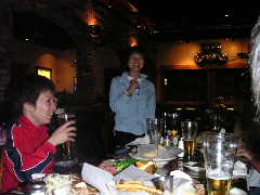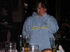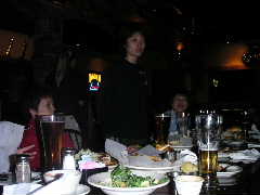 店に入ると昨日とまったく同じ長テーブルに案内された。各自お好みの地ビールなど注文し,団長の音頭でカンパ〜イ!料理なども各自適当に頼む。ゆうじくん今晩はゴハンは要らないらしい。1杯目のビールも早々に空け,2杯目というところで団長とゆうじくんはその名も「アリゲーターなんたら」という地ビールを注文。これがかなりダークで濃厚な1品となり,睡眠不足と疲労が重なるゆうじくんの中枢神経をしたたかに直撃した。以降しばらくゆうじくんの生体反応がなくなる。