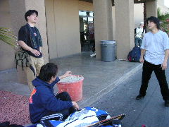 一服してリフレッシュした一行は再びリンクに戻り最後の大事な儀式「ポートレート写真の購入」に挑む。編集長はこれでやっと一人前のNARChとなるのである。一方筆者はNARChグッズを購入しにショップに。いつもの兄ちゃんがいないので,姉ちゃんにディスカウントをねだるが,まだ大会1週目ということで値引きできないとのこと。しばし,ごねているとパパが来て「男ならちっちゃいこと言わないでとっとと買う!!」と強気の発言。仕方なくイヤイヤお金を渡すと「どうせ渡すんだからそんなシケた顔しない!!」とさらに追い打ちが。昨年まで$20のギャンブルに興じてたことからすると,ほんと1年って長いと実感した。