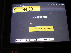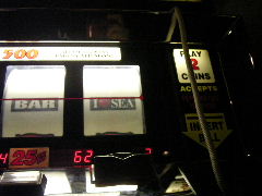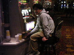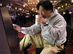 試合は終わったので,心おきなくもう一つの試合に繰り出す。実は編集長は昨日からJACKPOT狙いの台に投資していて,かなりつぎ込んでいる。K王と筆者はその周辺の台で編集長から指南を受けて勝負を。K王は小JACKPOTを出したので,感謝を表すため「おだけさん,ありがとう」と言いながらリールを回すのであった。筆者にもちいさな当たりが来たので,またまた編集長への感謝の念を表すため「おだけさん,ありがとう」と言いながらリールを回した。カジノ中央部で念仏のように「おだけさん,ありがとう」と合唱しながらギャンブルの興じる東洋人2名と,その隣でひたすら黙ったまま1台の台と真剣勝負に集中するちょっとジャッキー似の東洋人は,異彩を放っていたに違いない。ここからは編集長と台の勝負の行方を実況中継していこう。