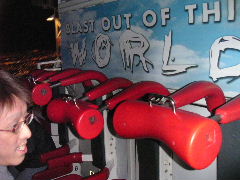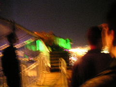 周囲をブラリと一周してから,勇者達は第1の試練「」へと向かった。外に出て列に並ぶと,件の乗り物の正体が徐々に明らかになってきた。2人並びで8人が緑色のジェットコースターのようなものに乗り込むと,乗り物が上方へと移動していく。乗り物自体は50メートル位の直線的なレールの端っこに乗っている。このレールがタワーの外側に平行移動してから,角度を下げて行くと,端っこに乗った乗り物は引力に従って,レール先端に向かって落ちていくのである。先端に達した乗り物はレールの先っぽでしばらく風に揺られてゆらゆらしたりしている。程なくするとレール先端が上に上昇し,再び引力に従いレール根元へと戻っていく。これを何回か繰り返すらしい。乗り物が先端部に移動していくたびに乗員達の叫声がベガスの夜空にこだまする。そんな破天荒な乗り物であった。事の次第を把握した編集・・・いや勇者は再び躊躇の声を上げはじめたが,既に切符を買っていることもあり,わりと簡単に説得できた。そして勇者達はベガスの夜空で別世界を体験したのであった。これから行くかも知れない熱心な読者のためにネタばらしはここではやめておこう。乗り終えた勇者はまさに一皮むけた男となって戻ってきたとだけ言っておく。