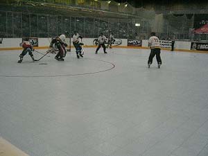 Rebelsというチーム。昨日まで全敗中である。選手もかなりの年配者が混じっている。試合前に「お手柔らかにね」とお互いに言葉を交わすが,本心はなんとか1勝を挙げたいのであろう。案の定,試合は接戦となる。スピードはそんなにないが,こちらのミスをついてカウンターをしかけてくる。しかも外人チームらしく,決定力はある。体力がないぶん,老獪にしかけてくるので油断ならない。そんななか後半開始早々ノブさんがハーフライン付近から放った目の覚めるような渾身のスラップが低い弾道で直接相手ゴーリーを直撃!バコォォーーン!!という音とともに相手ゴーリーはたまらずその場でもんどりうって倒れてしまった。しばし,リンク上を静けさが支配する。タイムがかかり相手チームがゴーリーの回復具合をチェックいる。一方チーム・ミスコンダクトベンチでは,いま観た壮絶な光景に興奮した面々が「すげぇーーー!!」とか「殺人スラップ!!」とかいいながら大いに盛り上がっている。同じゴーリーとしてタケヲくんは「なんて脳天気なベンチなんだ!」と少しあきれていた模様である。そしてまさにこの場で急遽ノブさんはゴーリーハカイダーと改名した。ハカイダースラップの威力が相手を威嚇したのか,後半はかなり優勢に試合を進めるも,なかなか得点をあげることができない。激しいやりとりのなか,Kap○aのスチックが折れ,件の話しどおり容赦なく編集長のスチックが戦線に投入されたことも付け加えておく。相手もかなり疲労しているが,こちらもおじさんなのでだんだんと体力がきつくなる。そんなとき,終盤同点になったところで,こちらがファールを犯しキルプレイに。万事休すかとみんなで固唾をのんで見守る中,編集長のスチックを持ったKap○aが逆にパックを奪い,一目散に相手ゴールめがけてダッシュ!そのまま編集長のスチックを使ってきれいなシュートを決めてリードを奪う!そしてそのまま試合終了。ベンチはもう大騒ぎとなった。特に1名「俺のスチックがぁ!俺のスチックが!」と興奮を隠せない男が1人いたことを報告しておこう。