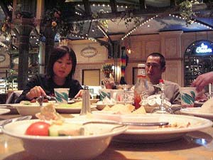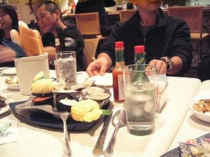 みなさんすっきりしたところでロビー集合。隣のホテルのビュッフェに。各自本日大サービスのシャンパンを紙コップについでもらって,乾杯!!昼というのに酔っぱらうまでシャンパンを飲んだ。そしてたらふく食べた。朝の運動分は優に超えるカロリー摂取量であった。途中で会場から戻ってきたKap○aとS原氏が合流。Team