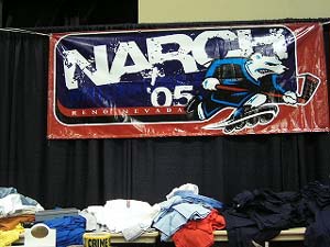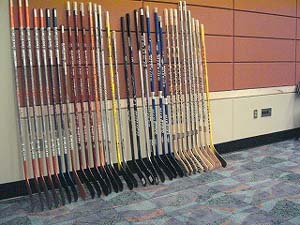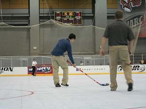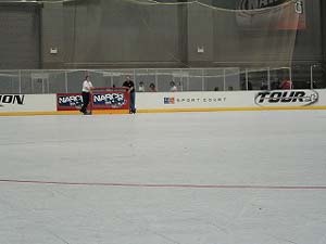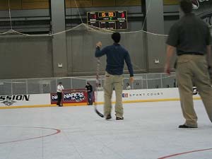 PRO決勝前に大会登録時にもらった抽選券でハーフタイムイベント参加者抽選会が行われた。厳正なる抽選の結果当チームからはO田氏&ゴーリーハカイダー氏道産子2名が当選!イベントはリンクの片方のゴール前からパックをシュートして,反対側のゴールに設置された15センチほどの穴を通すと$25,000ゲットというものであった。PROの試合そっちのけでホテルにマイスチックを取りに帰る2名の姿があった。