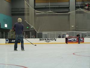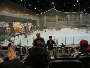 2名の男もはやPROの試合の行方はどうでもよくなってしまったようだ。そしてとうとうハーフタイムとなった。選ばれし道産子2名が各々スチックを手にリンクに上がった。まずはゴーリーハカイダー氏が司会の人に呼ばれた。自己紹介のあといよいよチャレンジ開始!狙い定めてシュート,しかし残念ながらパックは穴から逸れて失敗!会場からは大きなため息が。続いてO田氏の番が。先にやった数名の事例を検証し,狙いを定めて慎重にシュート・・・・・これまた大きく逸れてしまって,2名とも一財産を築くことに失敗してしまった。結局チャレンジャー全員失敗してイベントは終了。メインイベントであるはずのPROの試合後半が始まった。