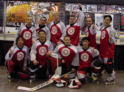 終わってみれば4−3と薄氷の勝利。チーム・ミスコンダクト全日程4試合を2勝2敗で終了。日本人の証としてリンクの横で集合写真を撮った。