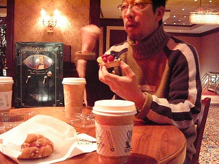 栄養の摂取もほどほどにということでホテルロビー横のコーヒースタンドで朝食を。ちょうど団長もいっしょになる。