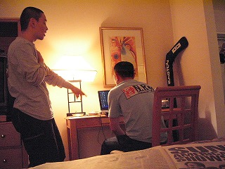 ホテルに到着するとチェックインの長い列。ここはタケヲくんが予約していたホテルなので,タケヲくんがホテルの会員カードを持っていたので,専用レーンで楽々チェックインができた。ありがとうタケヲくん。部屋に入りシャワーを浴びて一休み。と思ったらS原氏がPSPに没頭。しまいにはバッテリー切れとなる。