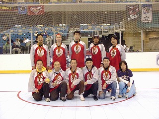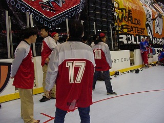 Over35の部全日程終了ということで,表彰式が行われた。団長からは話しがあったが,まだ半信半疑だった選手達ではあったが,3位表彰は通常行われないのであるが,日本から来た物好きなおじさん達に免じて特別に3位表彰式が挙行されることと相成った。。ということで団長から昨日返したジャージを再びもらってリンクに集合。「3位は,はるばる日本から着たチーム・ミスコンダクトォォ!!」と紹介され,名前を呼ばれた順に出て行くと,銅メダルを首にかけてもらった。編集長のときになぜかメダルがヒモから外れてコロコロと転がって行ったのがご愛敬。その後,2位,1位と表彰式は滞りなく進み,最後にNARCh公式カメラマンがゴール前で各チームの集合写真を撮ってくれた。スタンドに戻り,改めて銅メダルを手に取ると,これがかなりズッシリと重い。この重量メダルは茶色いリボンで首にかけるのだが,メダルの重さでリボンを通す鉄の輪っかがすぐに開いてしまうらしく輪っかが2重になっていた。さっき編集長の首から落ちたのは,そんな事情だったらしい。そしてすぐにしっかりしたものに交換してもらったらしい。