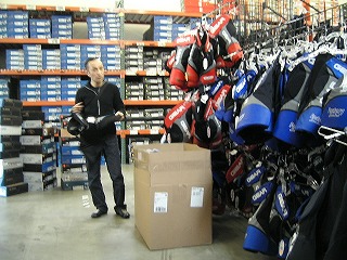 カモが笑顔とはいえ,意外と手強いと知ったおじさんはひとしきりしゃべると奥に引っ込んでいった。ここでS原氏は購入したスチックを切ってもらうついでに,クツの件を切り出した。これには店員二人「マジかよぉ〜」という感じで一瞬絶句したが「実はベイクすると耐久性が落ちる」と「いや,もう閉店で時間がないよぉ〜」ディフェンスで切り抜けようとした。が,執拗なS原氏の「でも,焼くだけ焼いてよぉ〜」「あとはクルマの中で30分履いてるよぉ〜」オフェンスにあえなく屈してしまった。平日夜7時閉店である。ベイクしたら少なくとも30分程度は履いたままにしておきたい。彼らも,若いんだか年取ってんだかわからないオヤジ2名にかまってる場合ではない。まあ,ベイクすれば外に出て行くらしいし,そうすれば閉店出来ると覚悟を決めたのか,S原氏のクツをMissionオーブンに放り込んでくれた。待つこと10分弱で焼き上がったクツをS原氏に手渡した。このころになると若者もこの熱心きわまる御仁に共鳴したのか「履いたら足を動かすなよ!」とか「絶対30分履いたままにしろよ!」とかアドバイスをくれた。