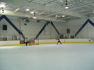 着替えてリンクに出ると,ひたすらシュート練習をしているかなりマニアックな御仁(たぶん30前後?)と中学生らしい男の子2名が適当に遊んでいた。我々東洋系年齢不詳2名はしばらくはパス練などをしていたが,やはりすぐに飽きてしまった。どちらからともなく,ピックアップをしようということになり,おじさんvs若者で無制限デスマッチを行うことに。とは言っても,総勢5名,ゴーリーもなくわりとダラダラとやっていた。そんな中,出ずっぱでへばってきた若者を尻目に,S原氏がリンクを駆けずり回っているのが,凄かった。マニアックくんも途中は省略,とりあえずシュートに命を賭けてガンガン打つ。筆者はウッドスチックのブレードが破損したのを口実に早々とベンチで休憩に入った。そんなことを30分くらいやったところで,若者の気力が失せ,休憩に。休憩中もS原氏はシュート練習に余念がない。このころにはアメリカ人達も,このお方がただ者ではないことを察知したようだ。再びやる気のない若者相手に30分ほどピックアップ。ピックアップが終わると,15分程度でリタイヤしベンチですっかりクールダウンした筆者に向かって,「いやぁ〜,いい運動した!」と宣った。