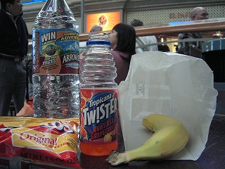 空港で従兄弟と別れてシンガポール航空のカウンターでチェックイン。しかし,諸般の事情でフライトが遅れるらしい。$15のお食事クーポン券が配られ,なんか食って待ってろということらしい。いまさっきチーズバーガーを食ったばかりでそんなにお腹はすいていないが,フードコートで水やら,ジュースやら,バナナを買う。店員のおばちゃんが「どうせ航空会社払いなんだから」と限度額ギリギリまでチートスとかまで買わされる。