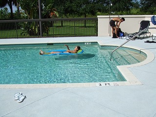 プールでは一足先にくつろいでいる御仁が。