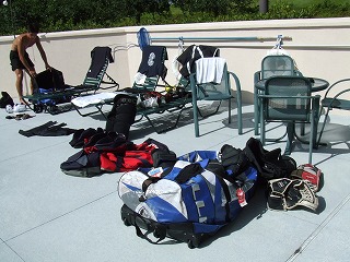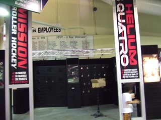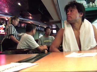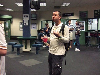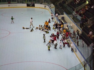 ギリギリでロッカーが空いて荷物を移動させ,アリーナへ。相手はこれまた強豪Tour Bordercats。試合開始早々から攻め込まれ失点を重ねる。気がつけば前半途中で0−8となりコールド負け。ほろ苦いアリーナデビューとなってしまった。8点目を取った相手がちょっとおちょくりの動作をしたらしく団長が激怒していた。その後ご当人がこちらのロッカーまで釈明に来た。「決して極東人の君たちを侮辱したんじゃない,自分のふがいないプレイに我を叱咤してたのだ伝々・・・」。8−0で勝っておいてそれはないだろ,とも思ったが必死に日米摩擦をもみ消そうとする当人を見て,Over35らしく「わかったよ」と言ってあげた。